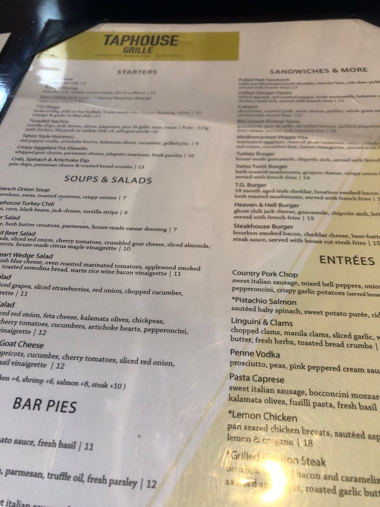 When it comes to appetizers, don't miss out on their delicious Taphouse Wings or comforting French Onion Soup. For salads, the Beet & Goat Cheese Salad and Caesar Salad are sure to please. And if you're in the mood for pizza, try their unique Hot Honey Pizza or classic Margherita Pizza.